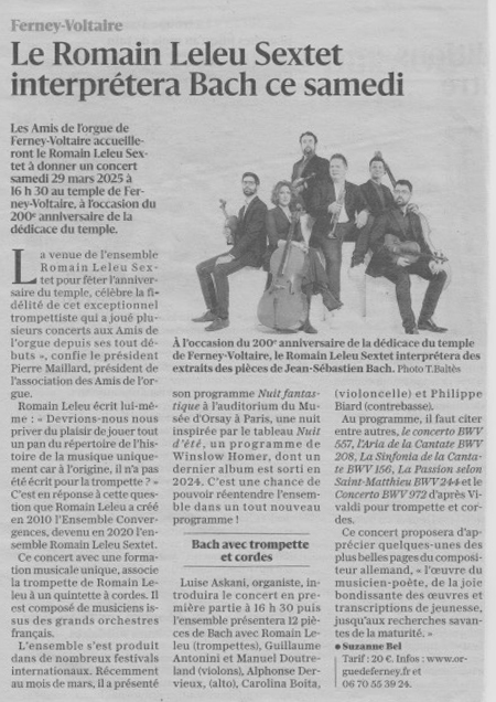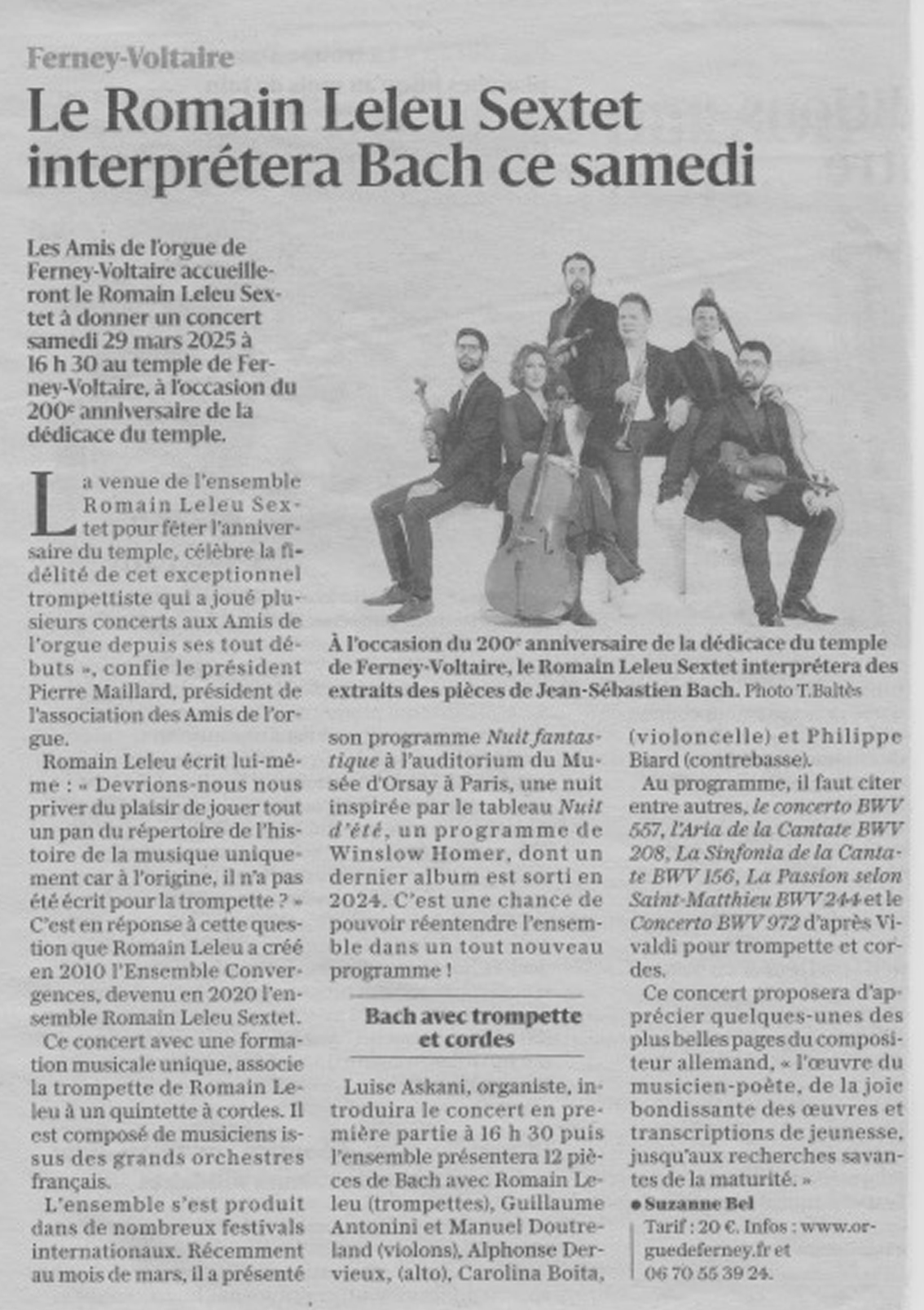 ARTICLES DE PRESSE – Concert 29 mars 2025 – SEXTET 5 CORDES avec Romain Leleu, trompette. Ouverture du concert avec Luise Askani à l’orgue